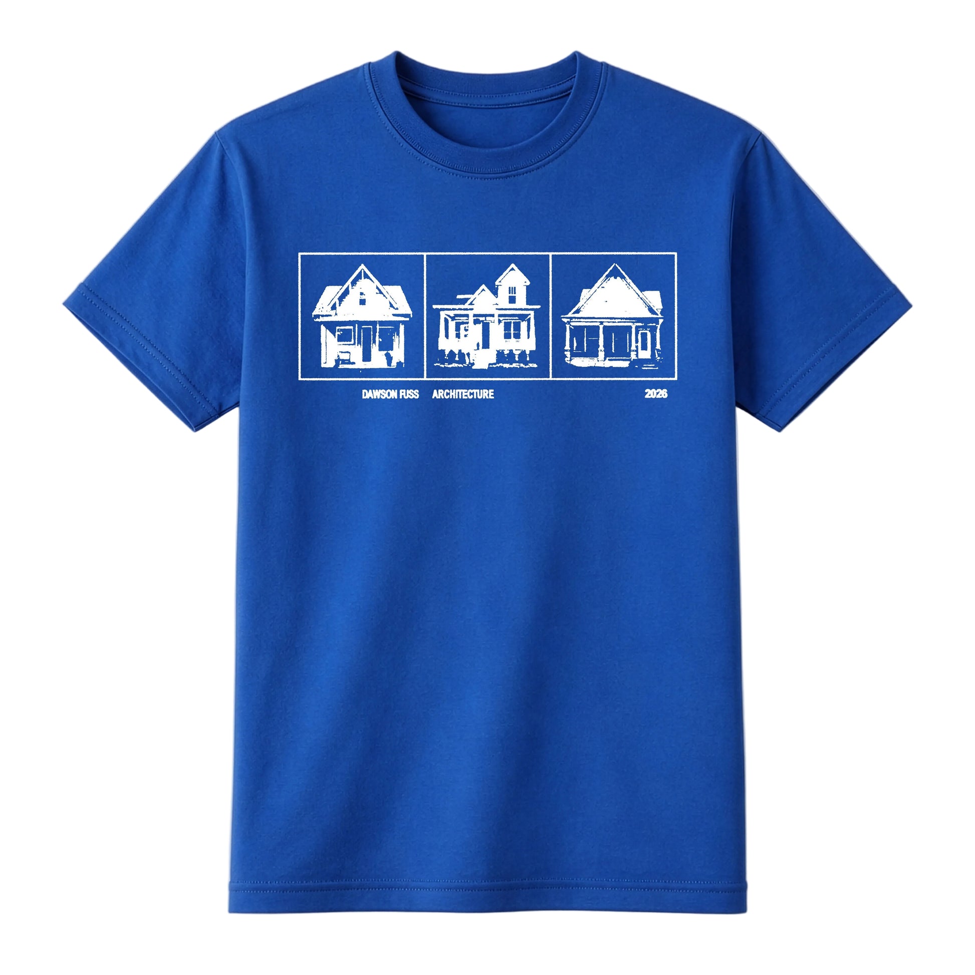 100% cotton royal blue t-shirt with white "ARCHITECTURE" design.